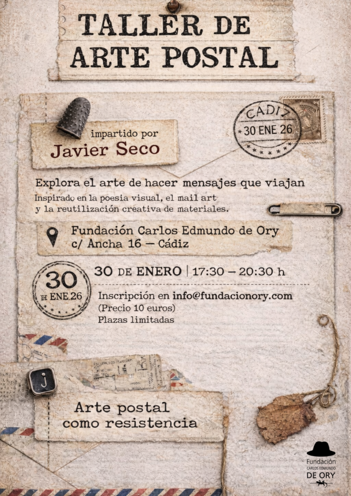 El viernes 30 de enero, entre las 17:30 h. y las 20:30 h., acogeremos en nuestra biblioteca un taller de arte postal impartido por el artista multidisciplinar Javier Seco. Crearemos nuestras propias obras para enviarlas por correo y que se expandan por el mundo. Sólo hace falta que traigas tus palabras y tu imaginación. Es preciso inscribirse en info@fundacionory.com (PRECIO: 10 euros. Se abona antes de empezar el taller). PLAZAS LIMITADAS ¿Qué es el arte postal? El arte postal es una forma de arte que consiste en enviar obras creativas a través del correo, con un enfoque en el intercambio…