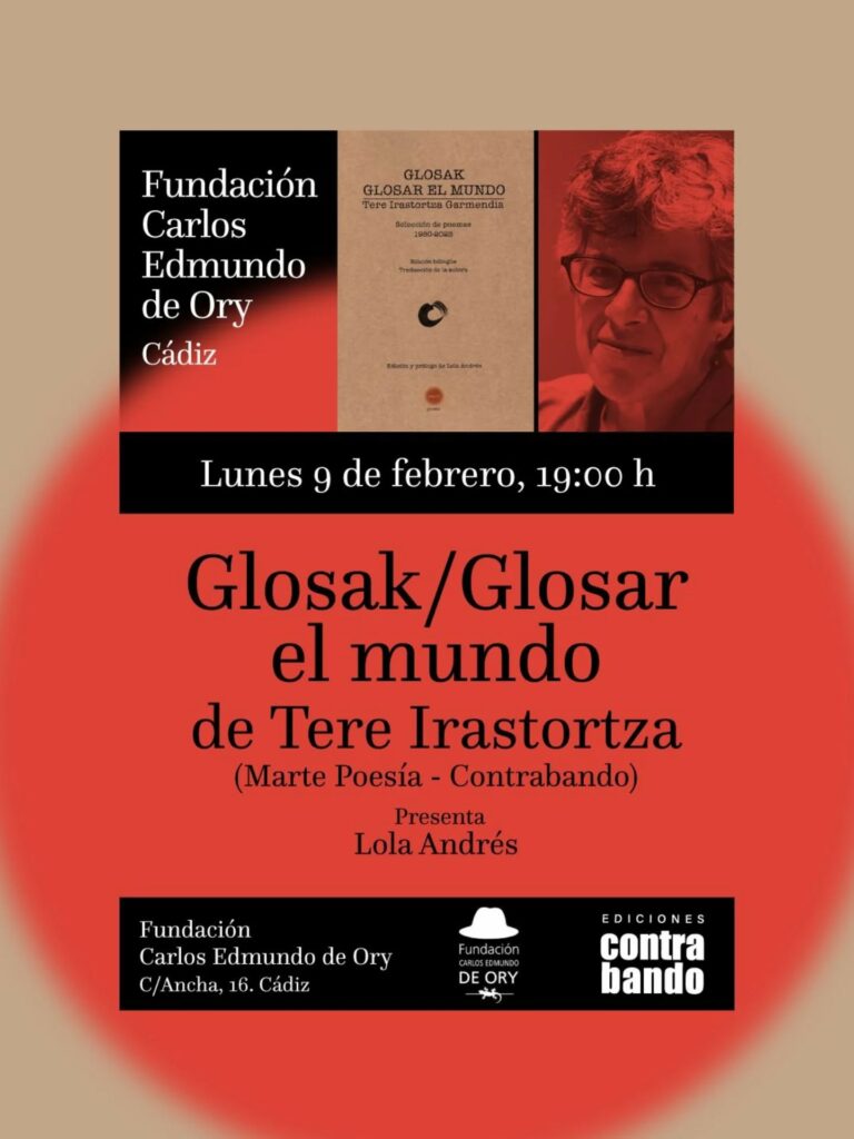El lunes 9 de febrero a las 19.00 h. presentamos a una de las voces fundamentales de la poesía en euskera, Tere Irastortza, que leerá poemas de 'Glosak' / 'Glosar el mundo' (Ediciones contrabando) con la editora y poeta Lola Andrés. «Una escritura tensa, se diría, al tanto de la vivencia y la oralidad que la conduce, capaz de albergar la mole −también tensa− de pensamiento y acción, creando (re-creando) una bolsa de sustrato lingüístico, cognitivo e intuitivo que irá creciendo y fertilizándose a lo largo del tiempo. Un mantillo para sí misma y para el ser con quien se…