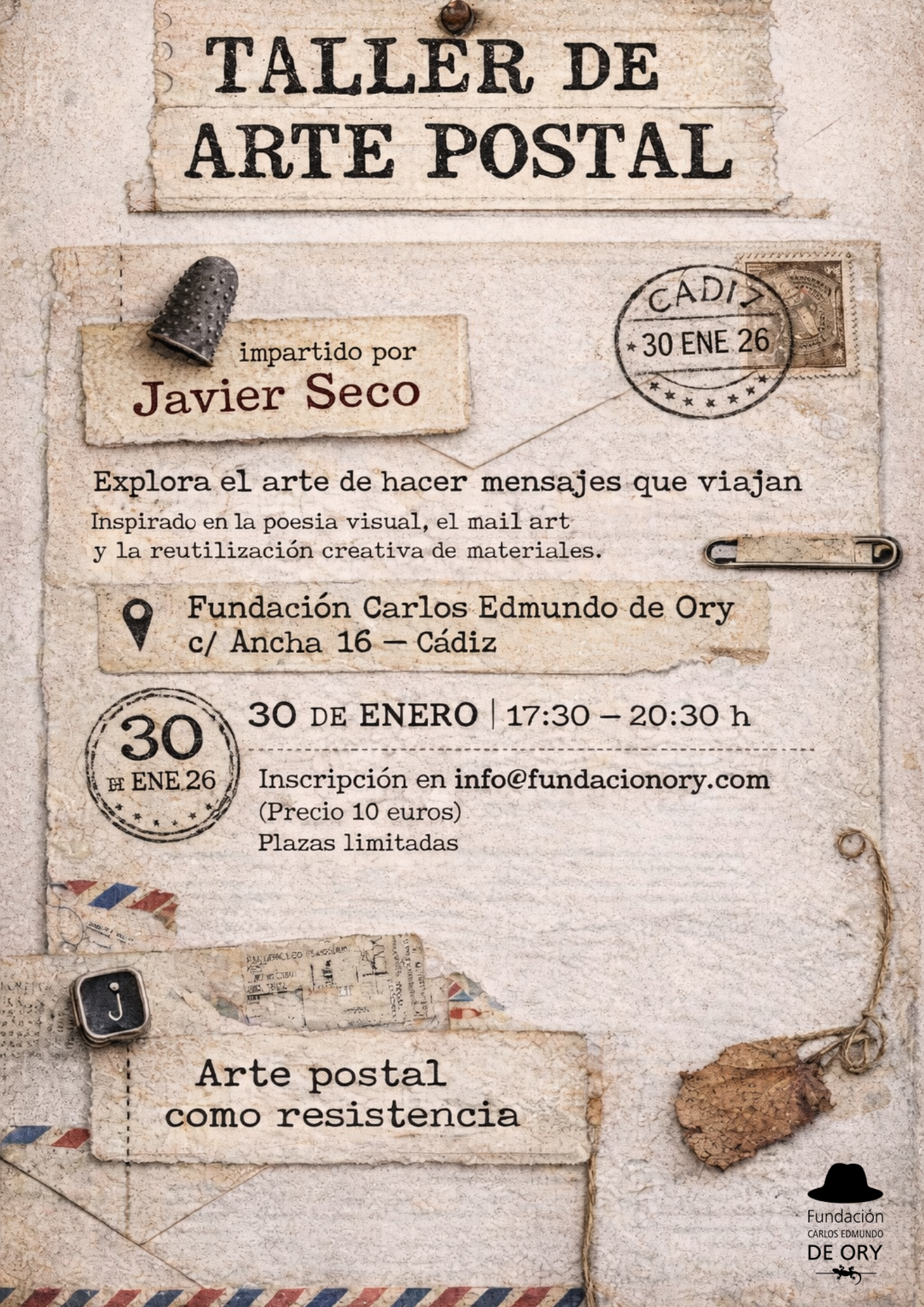 El viernes 30 de enero, entre las 17:30 h. y las 20:30 h., acogeremos en nuestra biblioteca un taller de arte postal impartido por el artista multidisciplinar Javier Seco. Crearemos nuestras propias obras para enviarlas por correo y que se expandan por el mundo. Sólo hace falta que traigas tus palabras y tu imaginación.